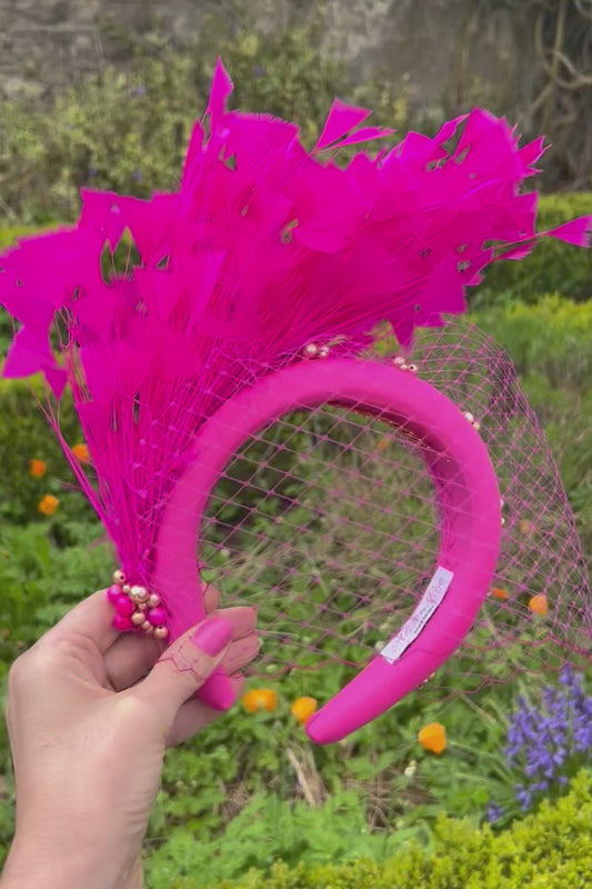 Cerise Pink Veiled Feather Headband for Hire (PK44)