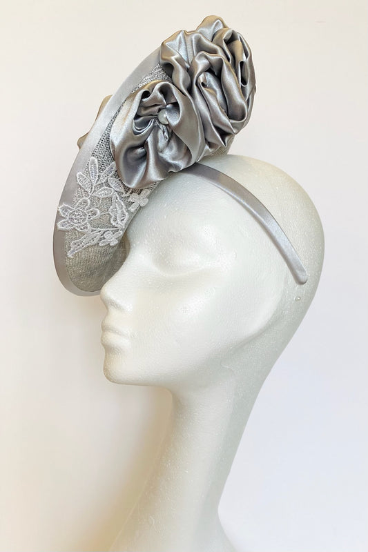 Silver Headpiece embellished with roses and lace for Hire (SG12)