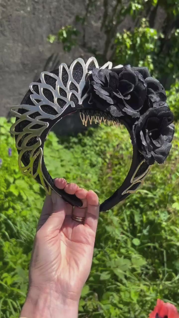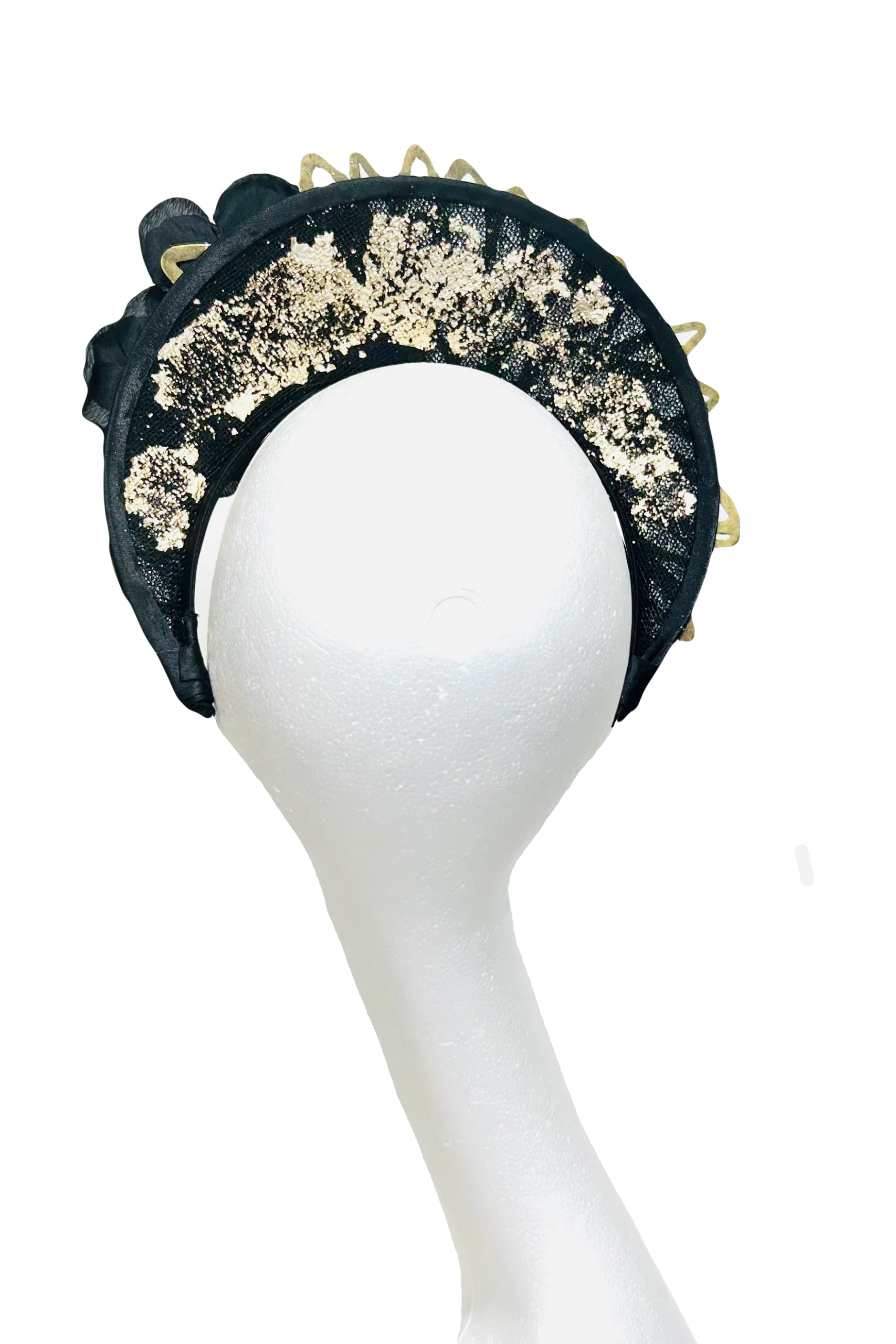 Black halo crown covered in gold laser-cut faux leather and flowers to the front and scattered gold leaf to the rear - now available to hire.