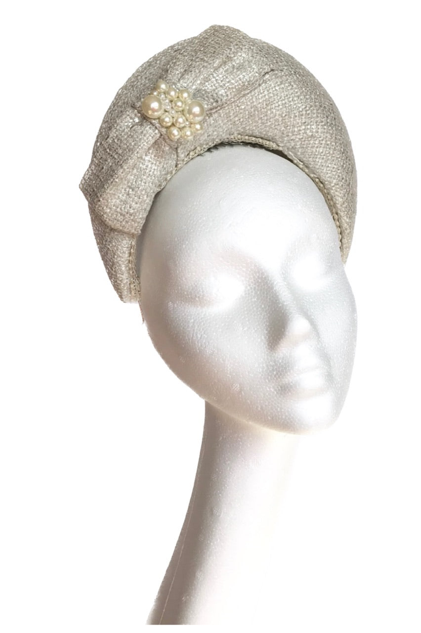 Our ‘Louisa’ halo crown style is so popular at the moment and now we have added one to our hire collection in a colour that will go with almost anything! This cream / natural colour fabric has a slight metallic thread running through it, which catches the light. Finished with a cute bow and hand-beaded pearls.