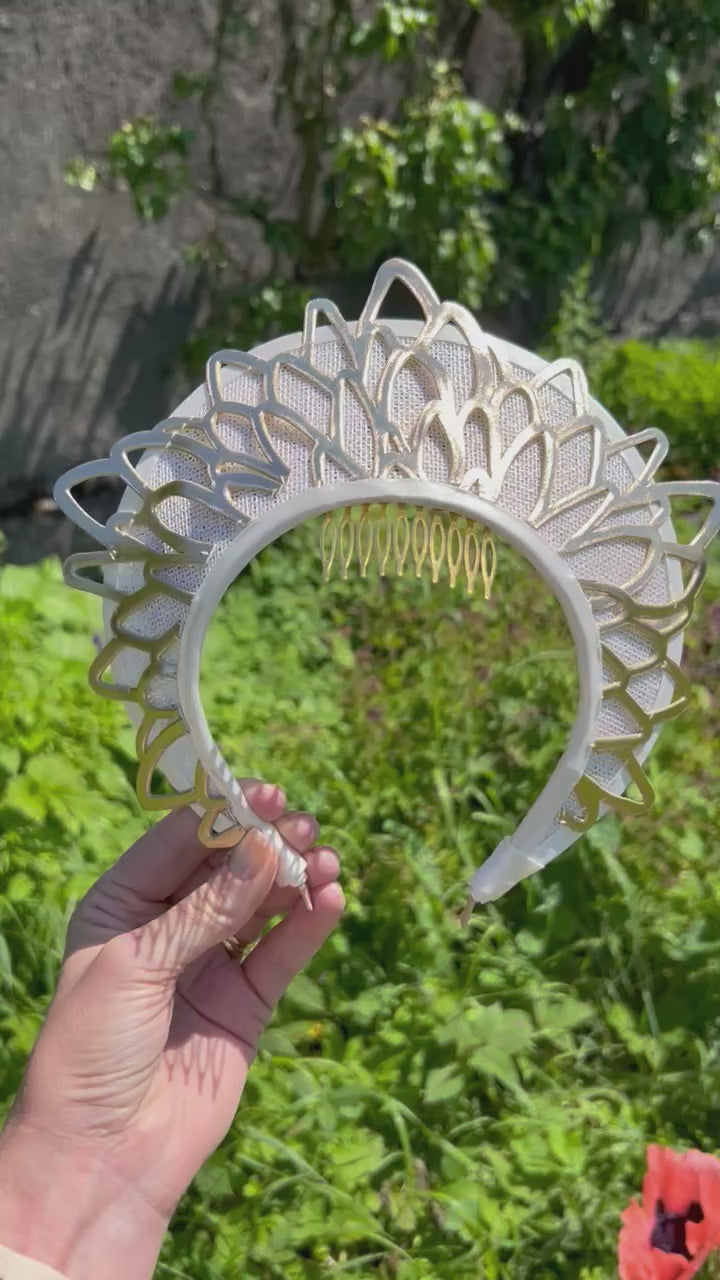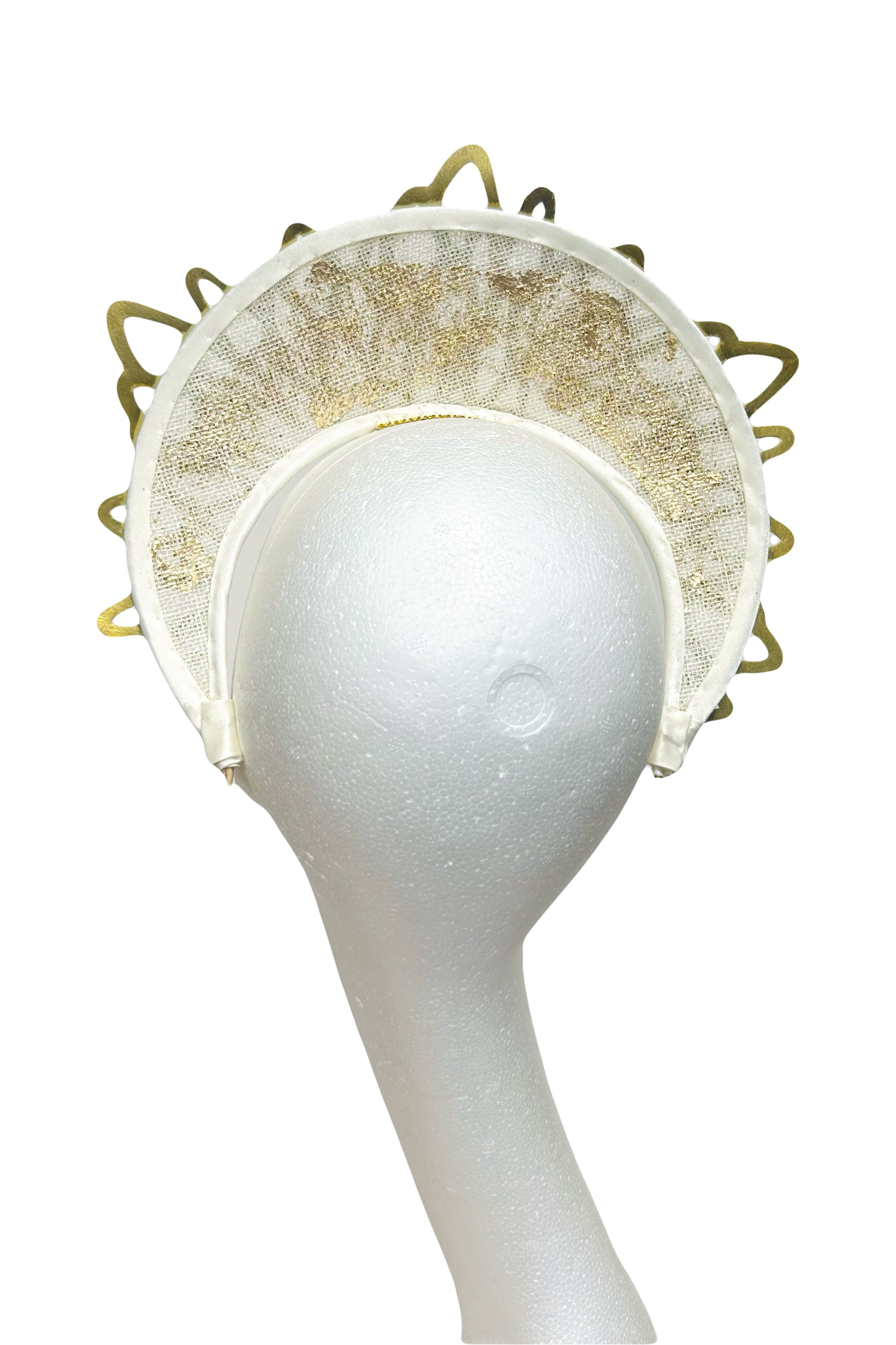 Ivory halo crown covered in gold laser-cut faux leather to the front and scattered gold leaf to the rear - now available to hire.