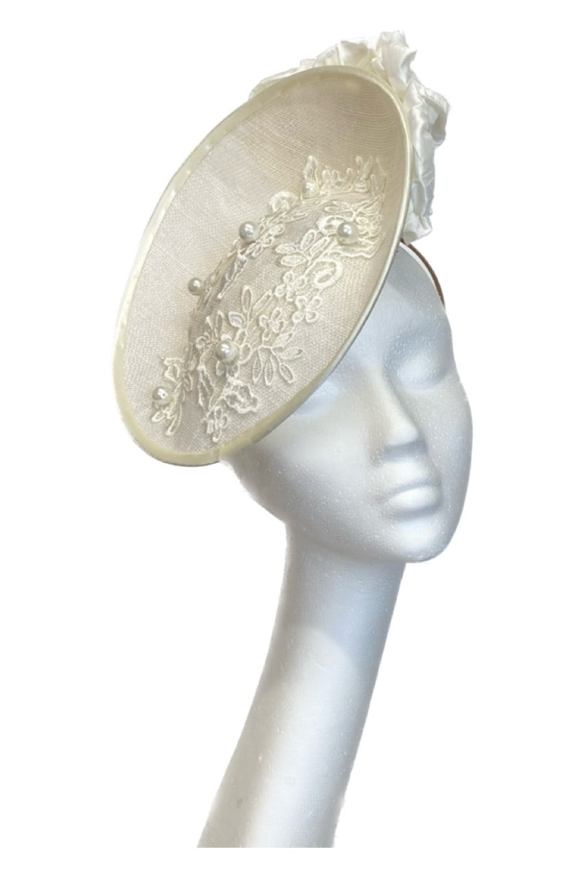 Ivory headpiece in sinamay embellished with handmade fabric roses and ivory lace. Affixed to the head with a hairband and additional comb - available to hire.
