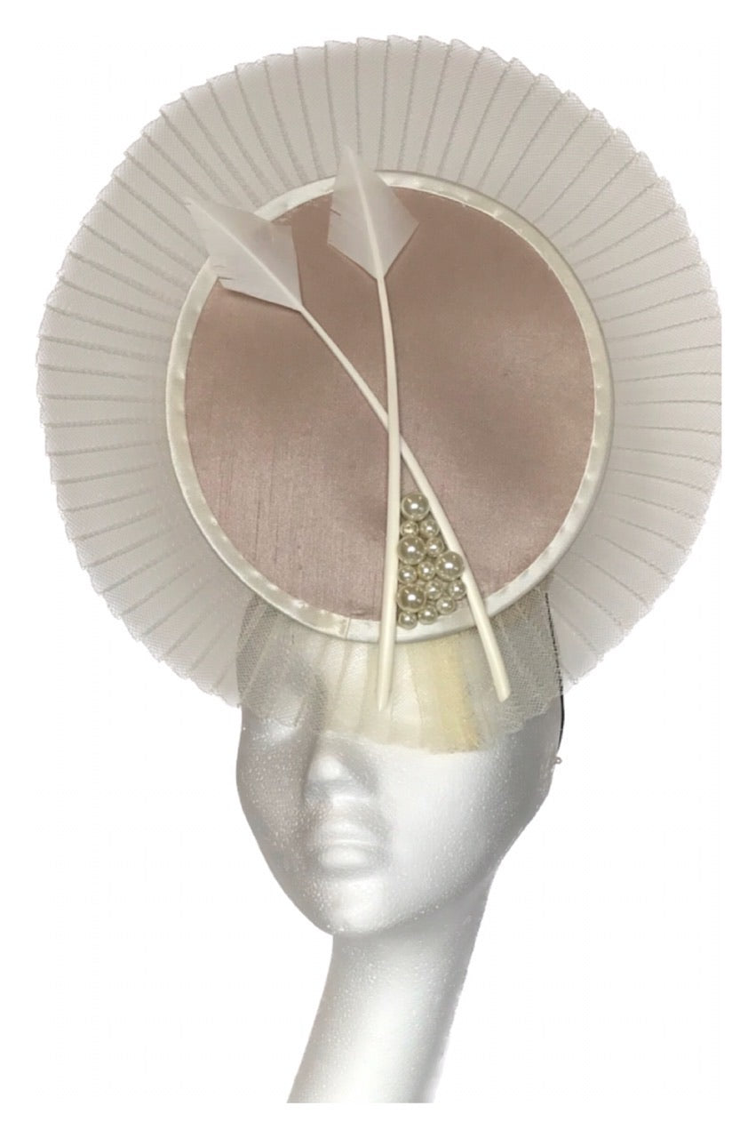 Unique ivory & taupe / blush percher headpiece with ivory crinoline brim, ivory arrowhead quills and hand-beaded pearls, available for hire.