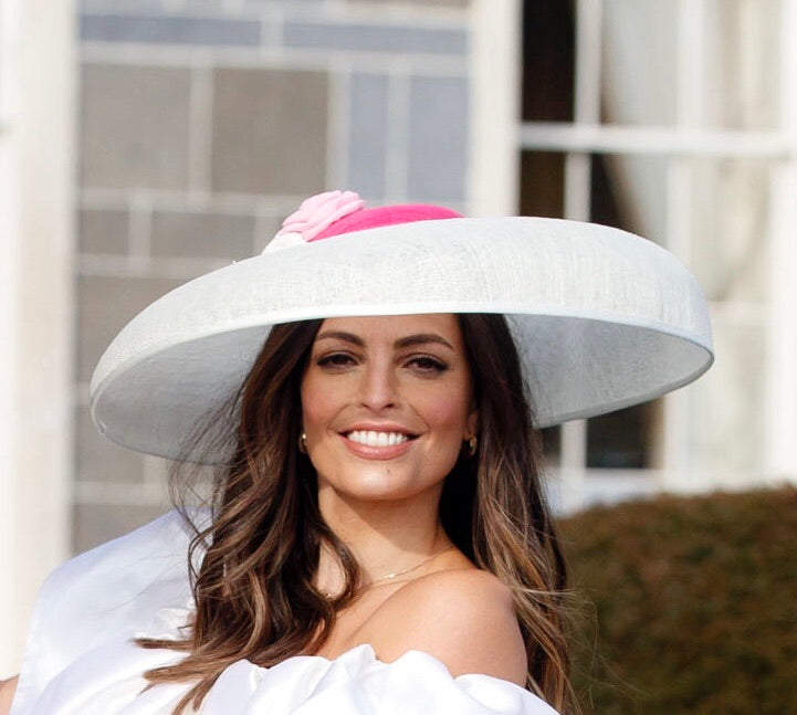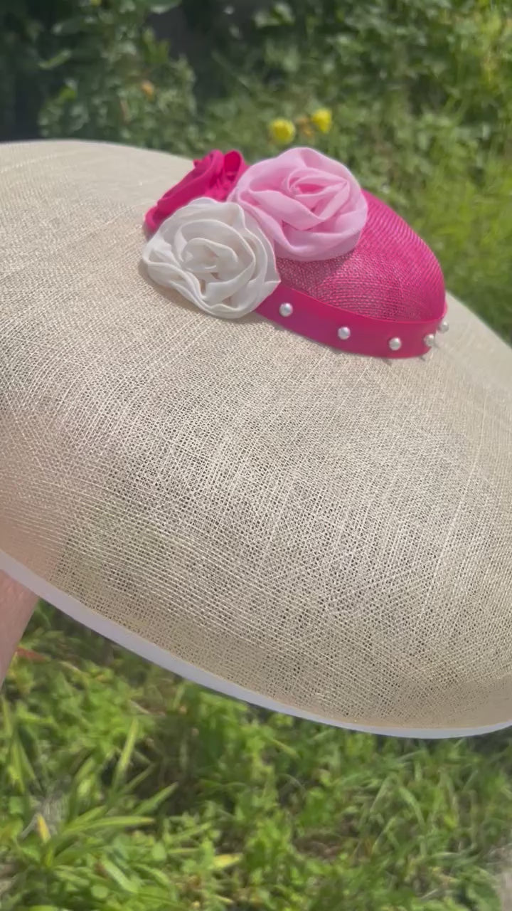 This is one of our large Ascot style hats. Available to hire in this colourway with a hot pink crown and ivory brim trimmed with handmade fabric flowers and pearls.