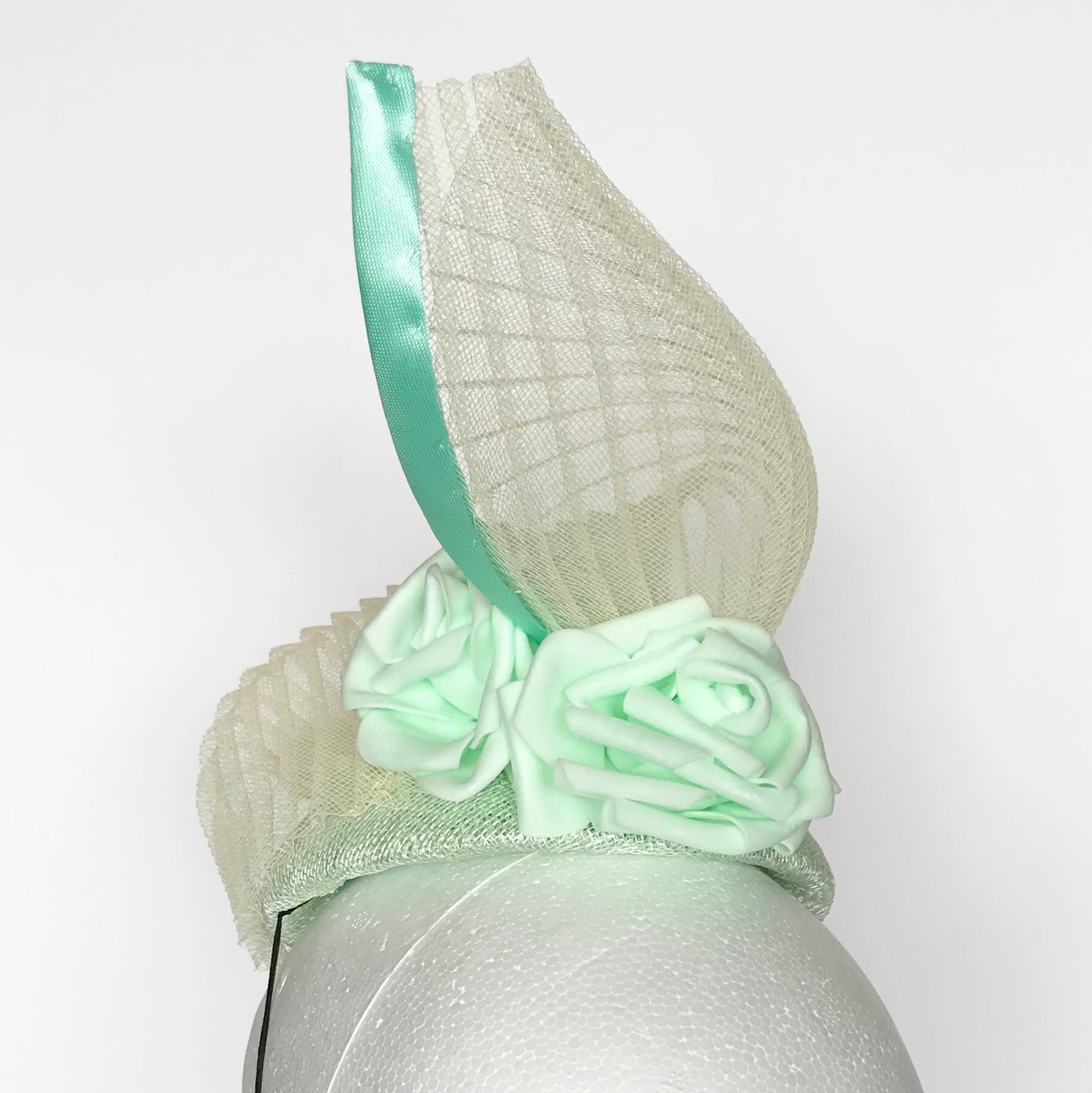 Mint green sinamay headpiece with ivory crinoline trim - available for hire.