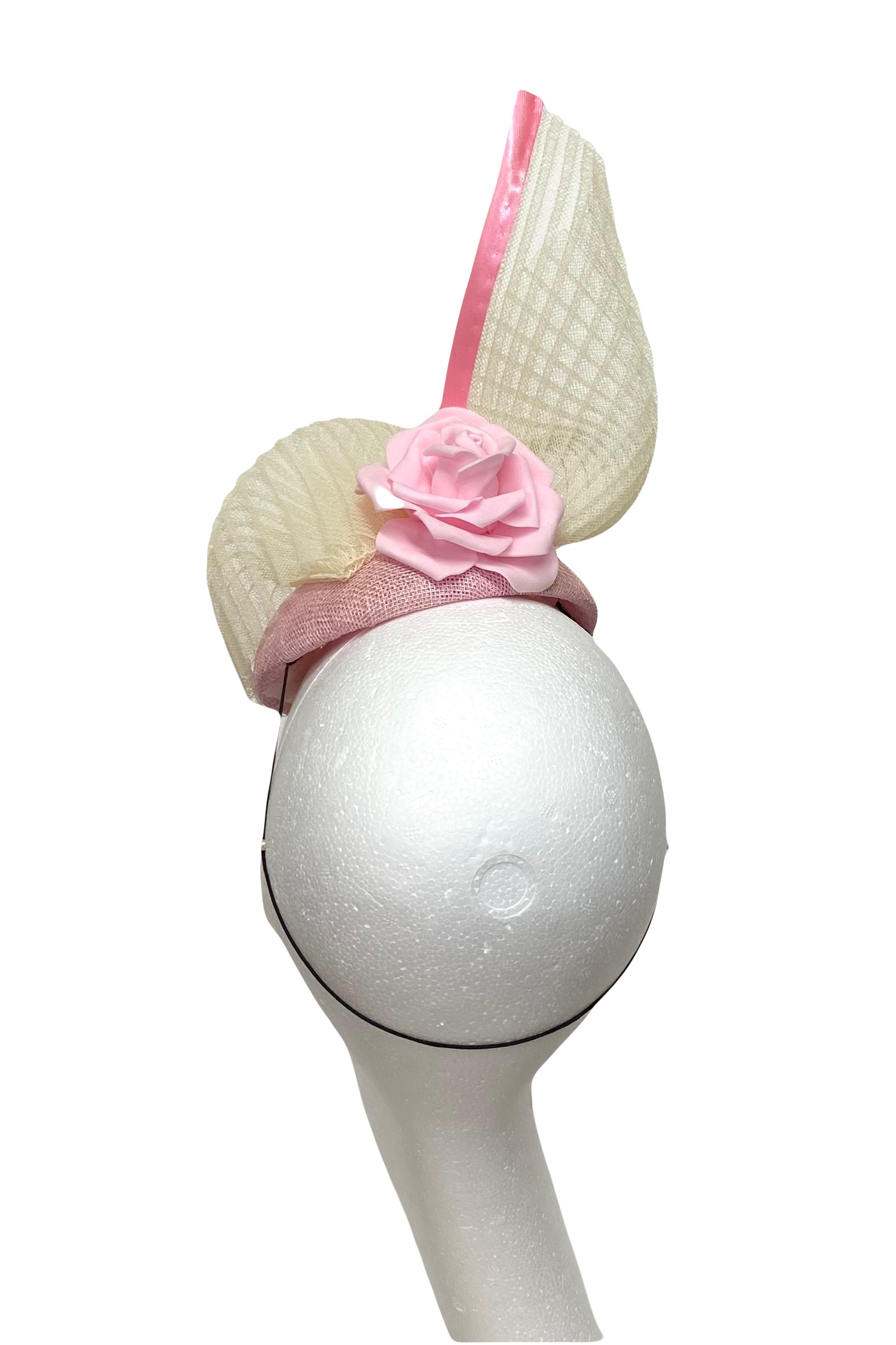 Pink sinamay headpiece with tulle overlay trimmed with ivory crinoline swirl - available for hire.